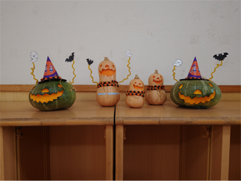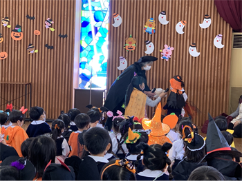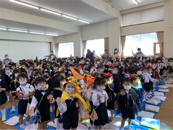 ホールに全員集まって、ハロウィンパーティーをしました。 |