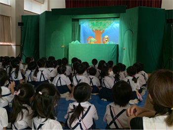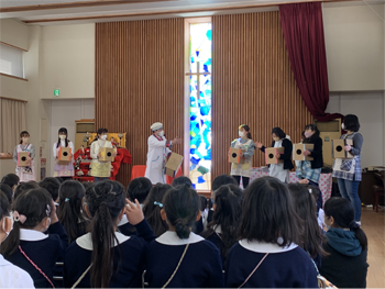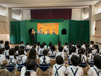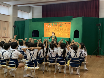 ひとみ座人形劇団のみなさまの講演を幼稚園ホールで全員鑑賞しました。 |