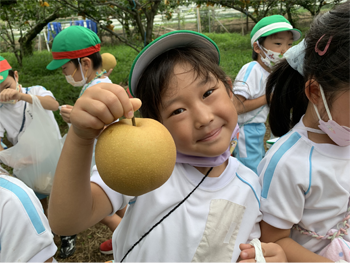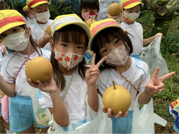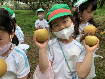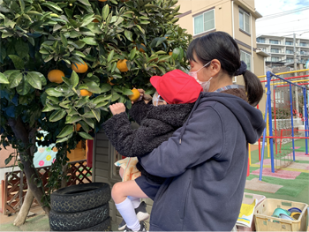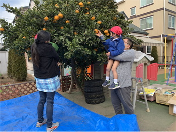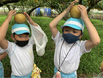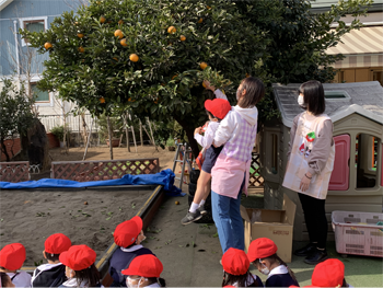 園庭に育っている夏みかんを、年少のみんなで収穫しました。 |
