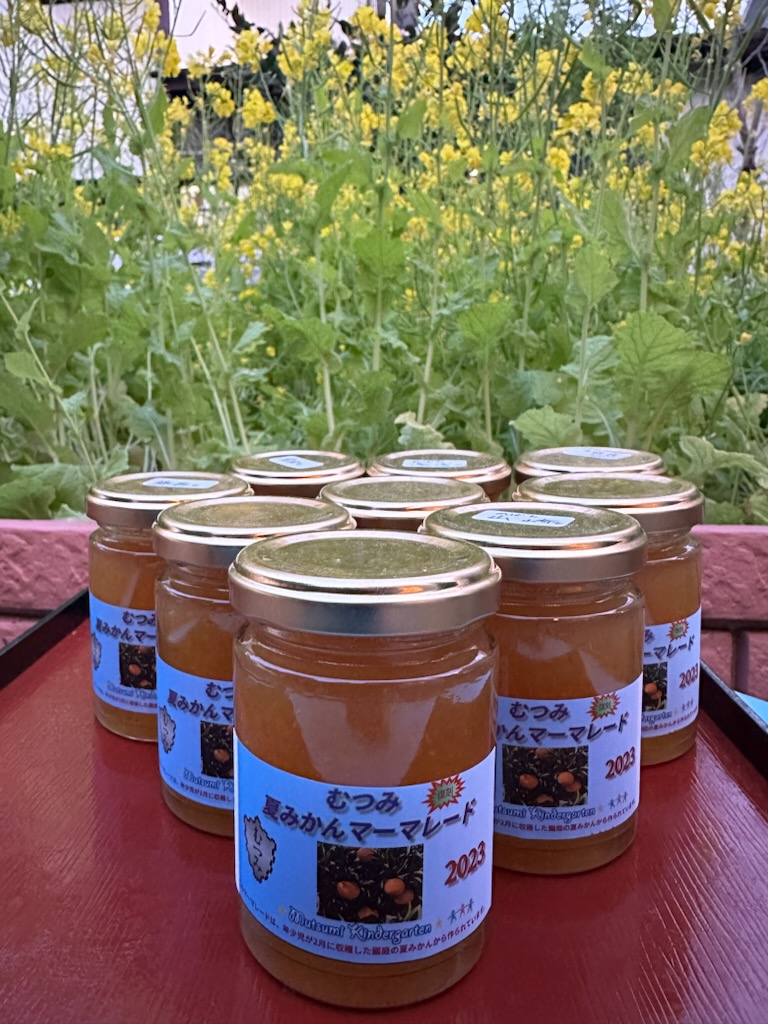 2023年2月7日に、年少児が収穫した夏みかんですが、「オレンジマーマレードジャム」に変わりました。 |