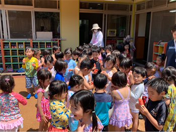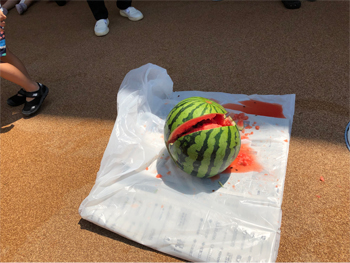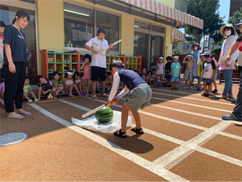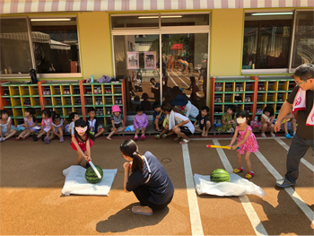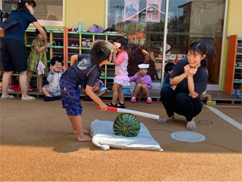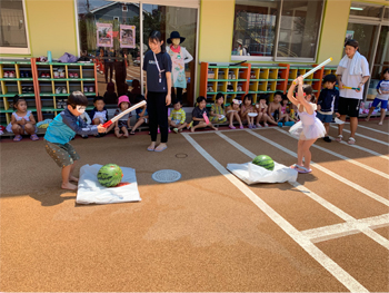 2023年7月28日に、預かり保育でスイカ割りを行いました。 |