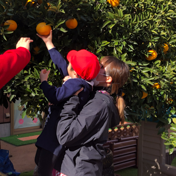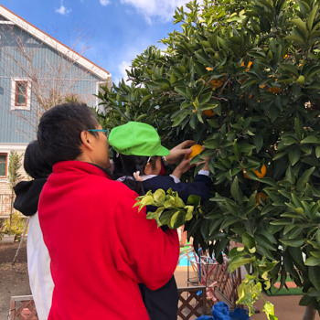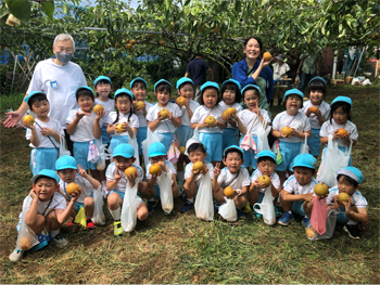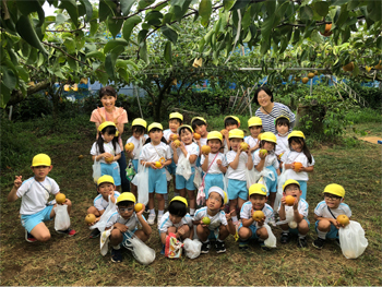 園庭に育っている夏みかんを、年少のみんなで収穫しました。 |